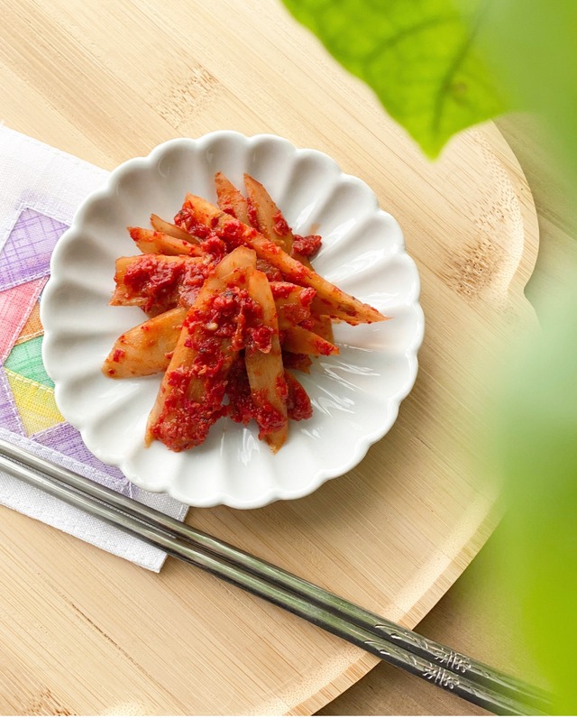 サムギョプサルなどのお肉料理にはもちろん、刻んで薬味として食べても美味しいです。 醤油とゴマ油が香るオリジナルのタレで漬け込んでます。 シャキシャキとした食感もよく、アレンジ万能なキムチです。